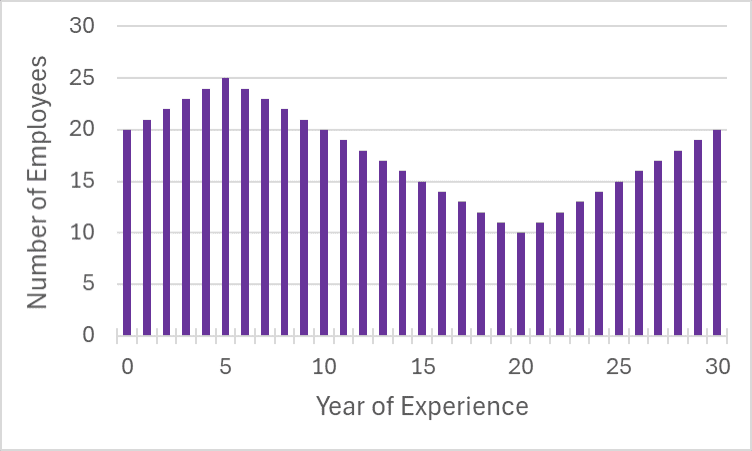 The first requirement is a histogram, which is essentially a bar graph that represents the frequency of data points in various categories. For our purposes, this histogram will display the number of employees categorized by years of experience. This visual representation helps us understand the current composition of our workforce—highlighting, for instance, whether we have a predominantly young workforce or a deeply experienced one. It sets the stage for strategic hiring by showing where there are gaps in experience that need to be filled. Below is an example of what an employee experience histogram might look like.